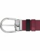 D’un côté, le cuir grainé noir apporte une touche classique et intemporelle, idéale pour les occasions professionnelles ou sophistiquées. De l’autre, le cuir cassis lisse confère une note subtilement audacieuse, parfaite pour affirmer un style distinctif. Cette combinaison réversible permet de varier les styles avec une seule et même pièce. La boucle ardillon en forme de fer à cheval, sublimée par une finition palladiée polie, ajoute un éclat luxueux à l’ensemble. L’emblème Montblanc orne délicatement la boucle, signature discrète de l’excellence de la maison.