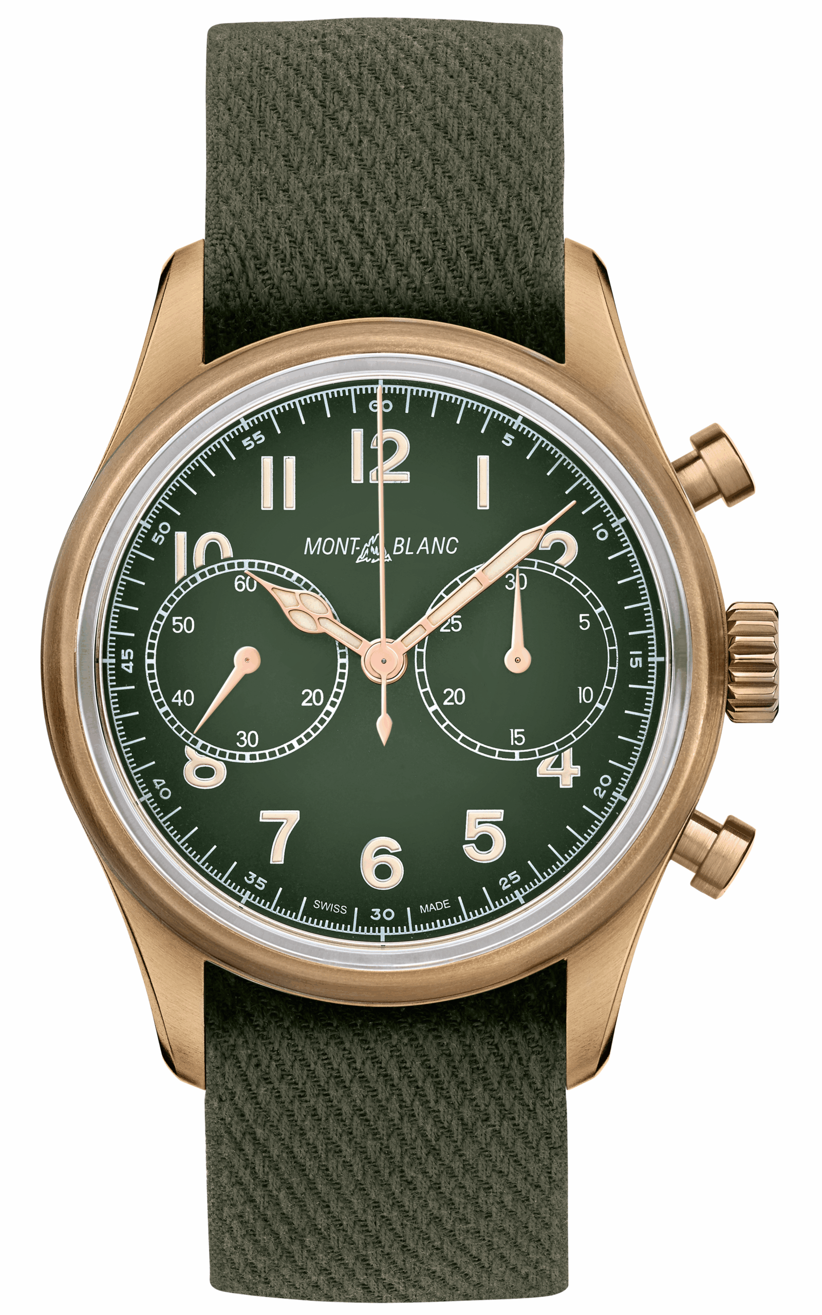La ligne Montblanc 1858 est inspirée de montres professionnelles légendaires produites par Minerva dans les années 1920 et 1930 pour l’armée et l’exploration. Réinterprétant ces modèles d’exception, Montblanc 1858 reflète l’esprit de l’exploration en montagne et s’inscrit dans la tendance actuelle d’un retour à la nature. La montre 1858 Chronograph Limited Edition 1858 se présente avec un boîtier intégralement en bronze de 42 mm et un cadran vert kaki qui offre un fond saisissant aux compteurs bi-compax. Le fond du boîtier est gravé de l’emblématique mont Blanc, d’une boussole et de deux pics à glace croisés, en clin d’œil à l’univers de l’alpinisme. Pour une lisibilité parfaite et une esthétique saisissante, le cadran kaki est pourvu d’aiguilles contrastantes et luminescentes de forme cathédrale au design cloisonné et légèrement bombé pour plus de raffinement. Le cadran est également orné de chiffres arabes enduits de SuperLumiNova* beige, d’une minuterie chemin de fer et du logo Montblanc original des années 30, avec sa police historique et une représentation du mont Blanc. Pour renforcer son allure contemporaine, la montre est équipée d’un bracelet NATO tissé de haute qualité dont la couleur kaki rappelle celle du cadran.