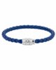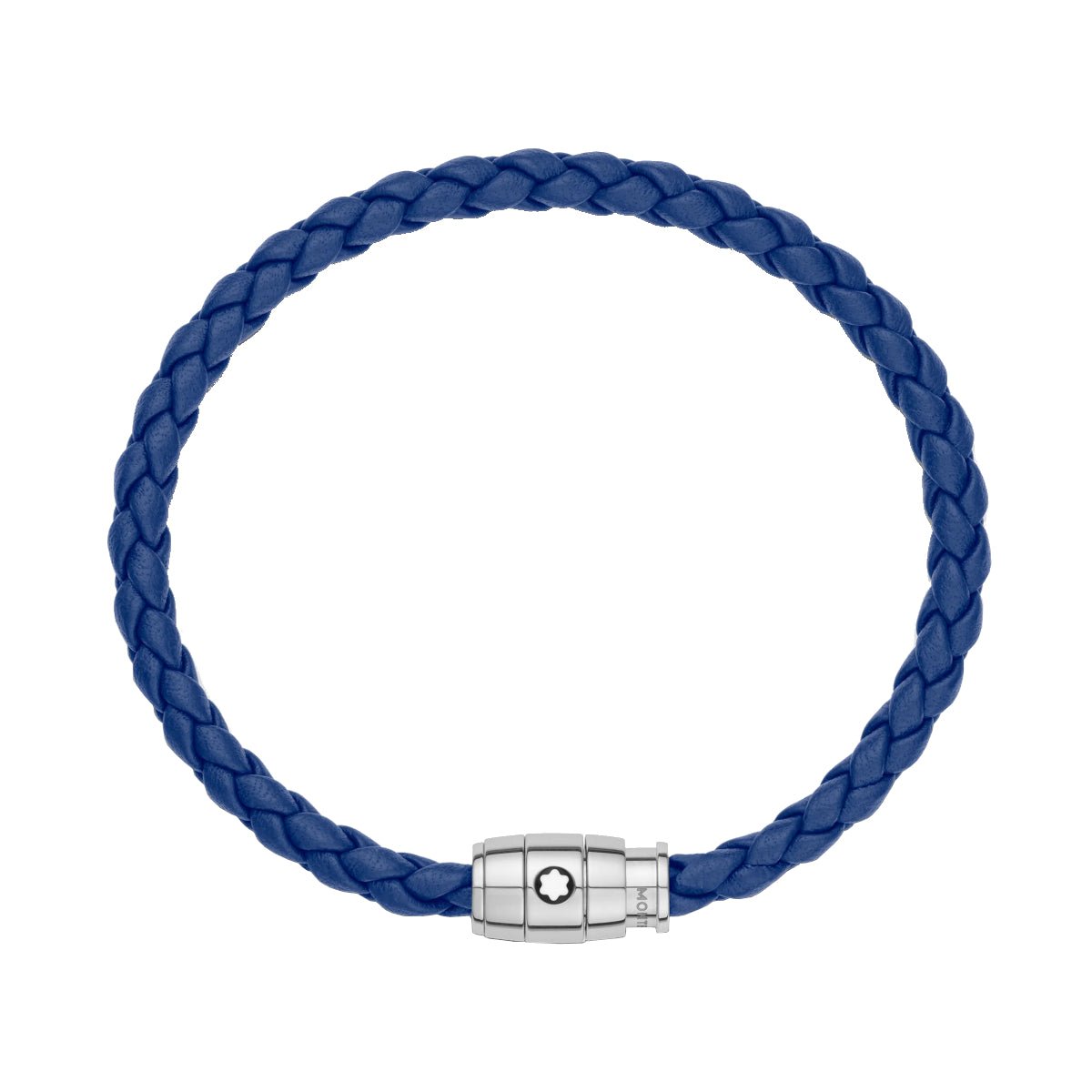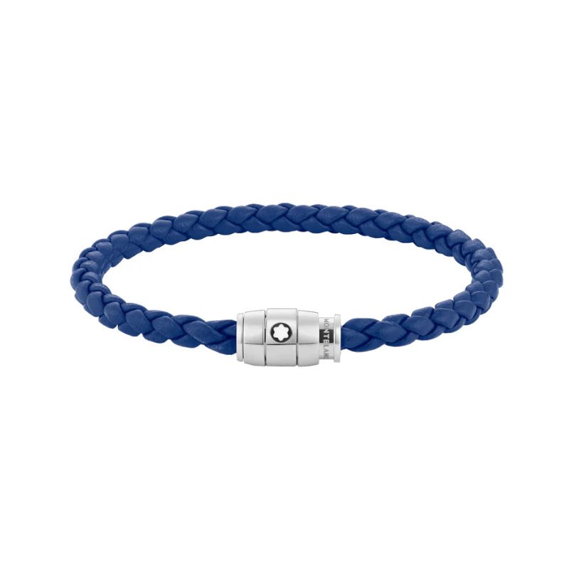 Ce bijou, tissé à partir de cuir bleu, est doté d’une boucle en acier inoxydable poli avec un anneau en acier rehaussé de l’emblème Montblanc.